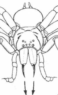 Les Mygalomorphes sont des araignées primitives dont les origines remontent à l’ère primaire (400 millions d’années, Dévonien). Ils se distinguent principalement des Aranéomorphes par des chélicères parallèles et très développés et par un corps très massif (=> Voir plan d’organisation d’une Mygale)
